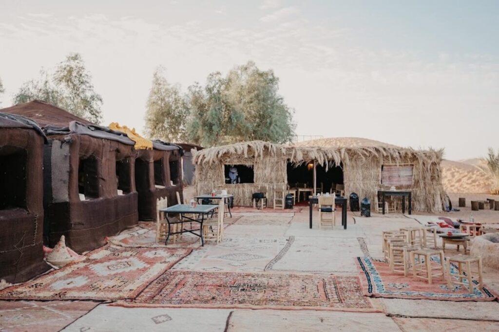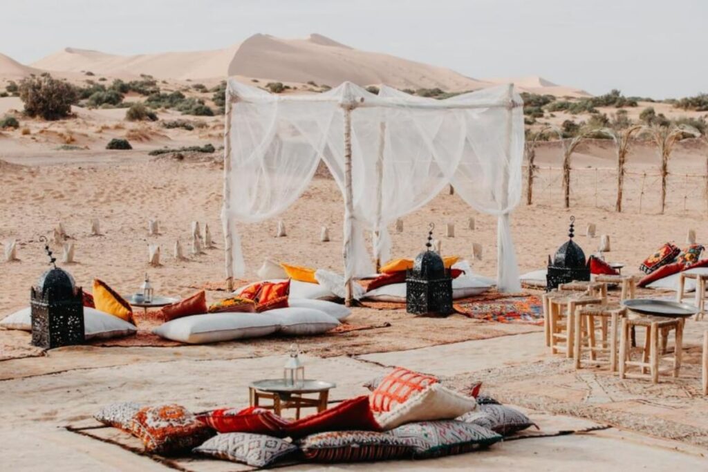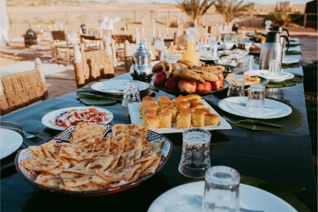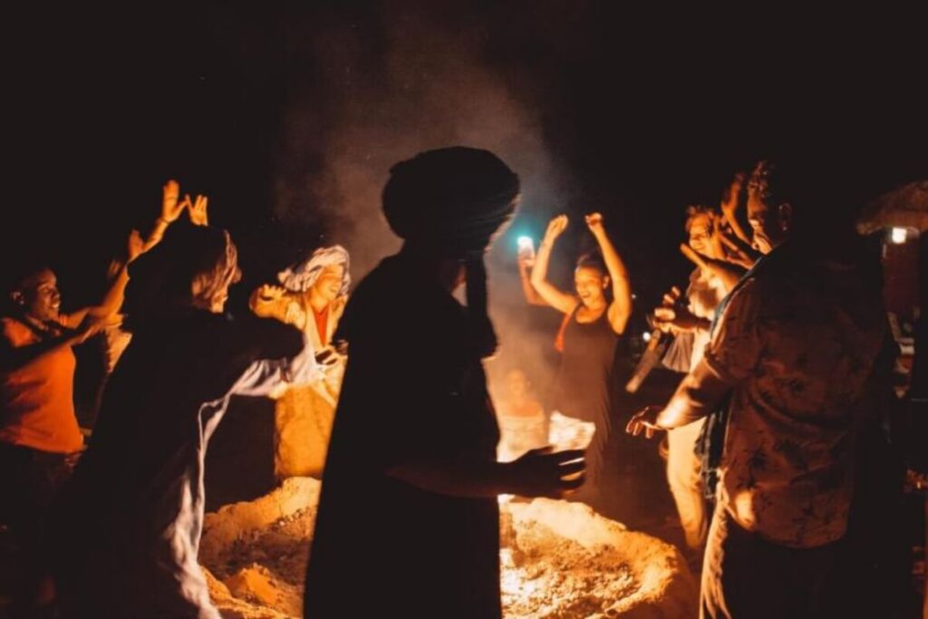 - Moroccan dinner, campfire atmosphere, and desert music at night.